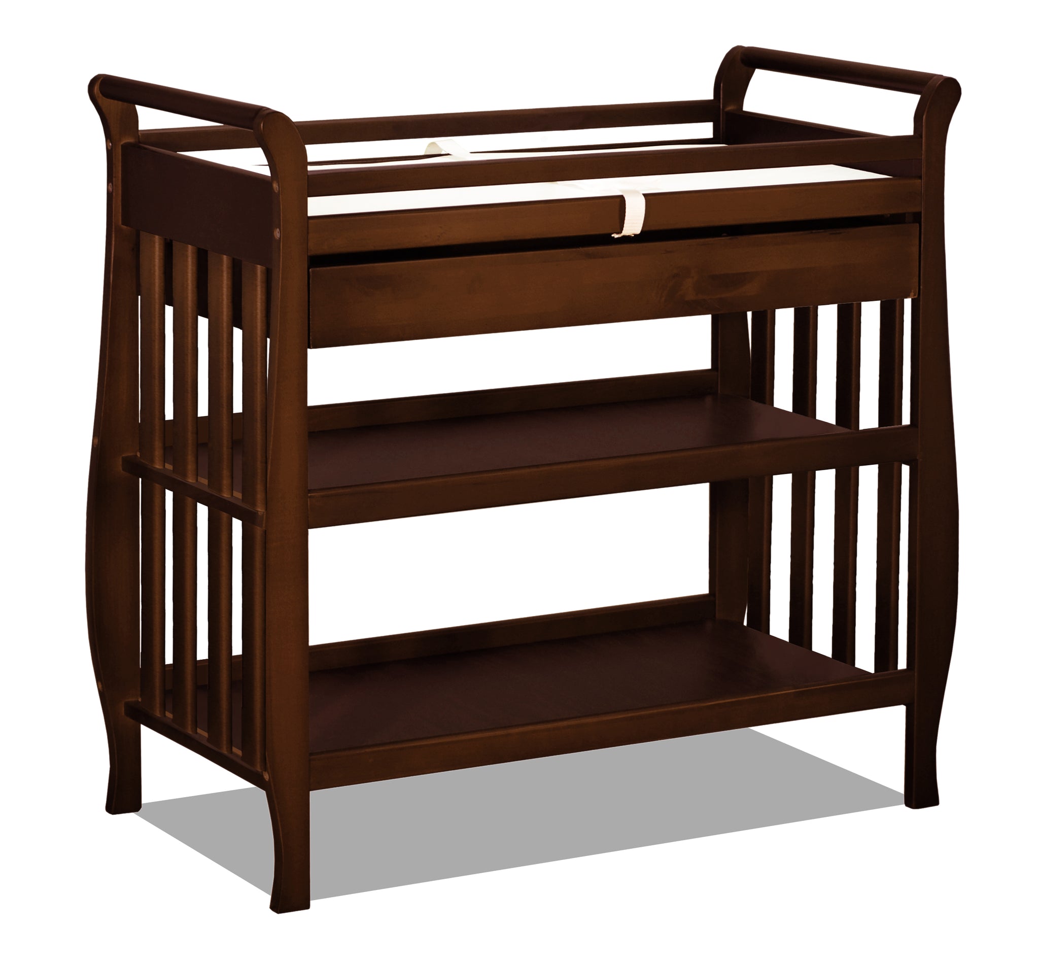 The Nadia Changing Table is constructed of solid pine wood available in a variety of classic finishes. The sleigh style changing table is designed with safety and comfort in mind. A safety strap and 1-inch pad is offered for the changer top. Storing your baby necessities has never been easier with the attached drawer, which glides smoothly over metal runners, and two open shelves for other items. A smooth sleigh style changing table can be paired with any Athena crib.