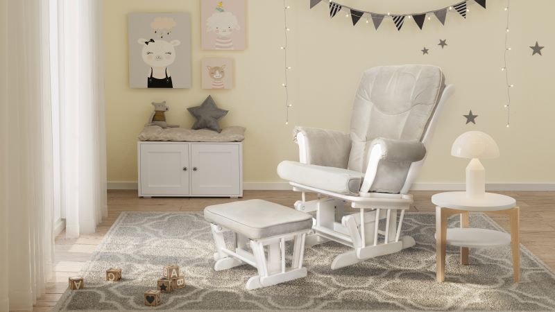 The Sleigh design glider provides comfortable seating in the nursery, living room, or office. It is ideal for nursing your baby, watching TV, or simply relaxing. The sturdy hardwood construction and generous padding on the seat, back, arms, and ottoman will ensure your enjoyment. Top quality steel ball bearing glides on both the chair and ottoman makes the gliding action smooth and quiet. It's all about luxury and comfort, and makes a wonderful gift for new parents-to-be.