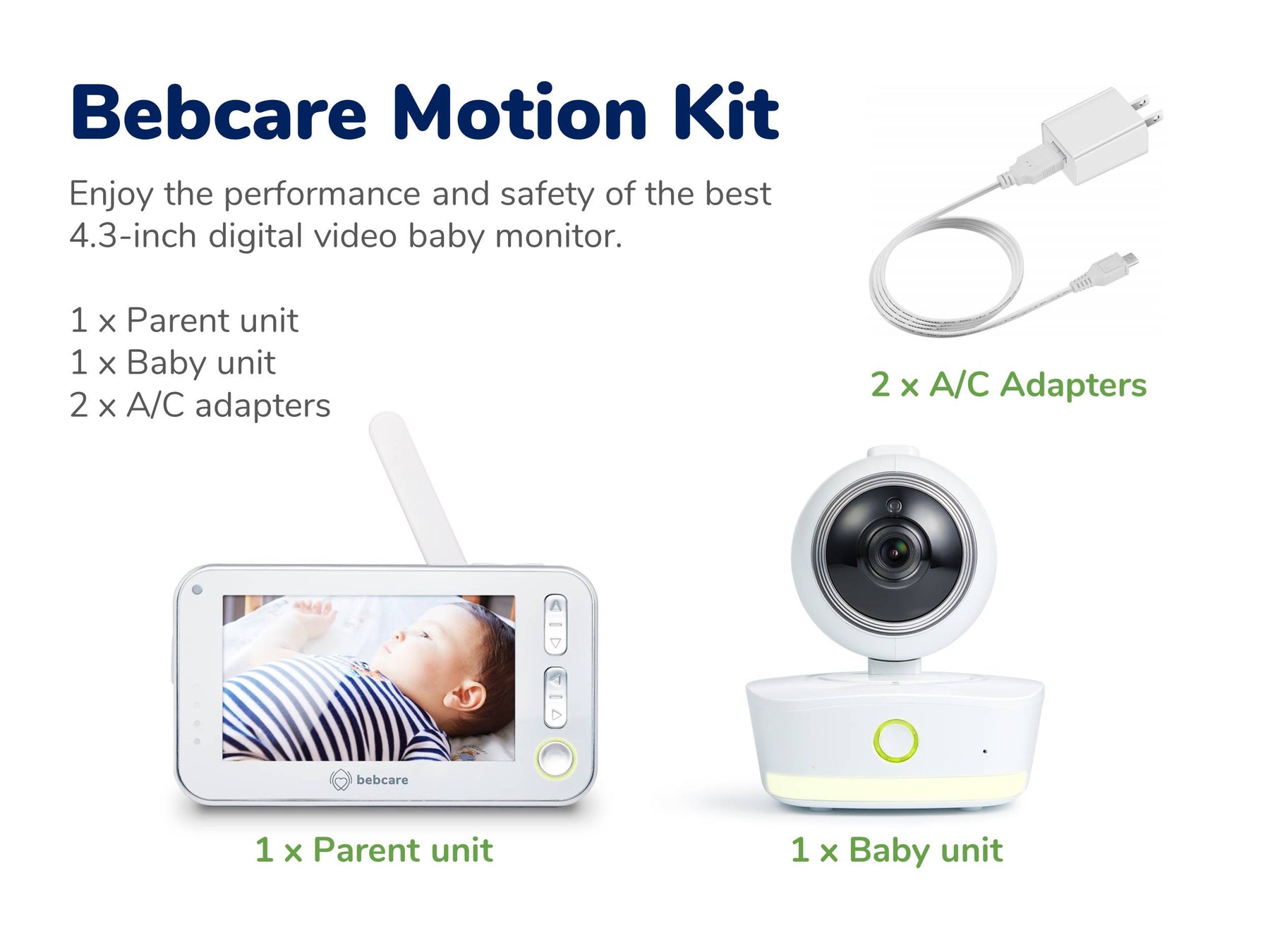 One Bebcare Motion monitor with 4.3-inch parent unit and one Bebcare IQ camera compatible with the smartphone app.