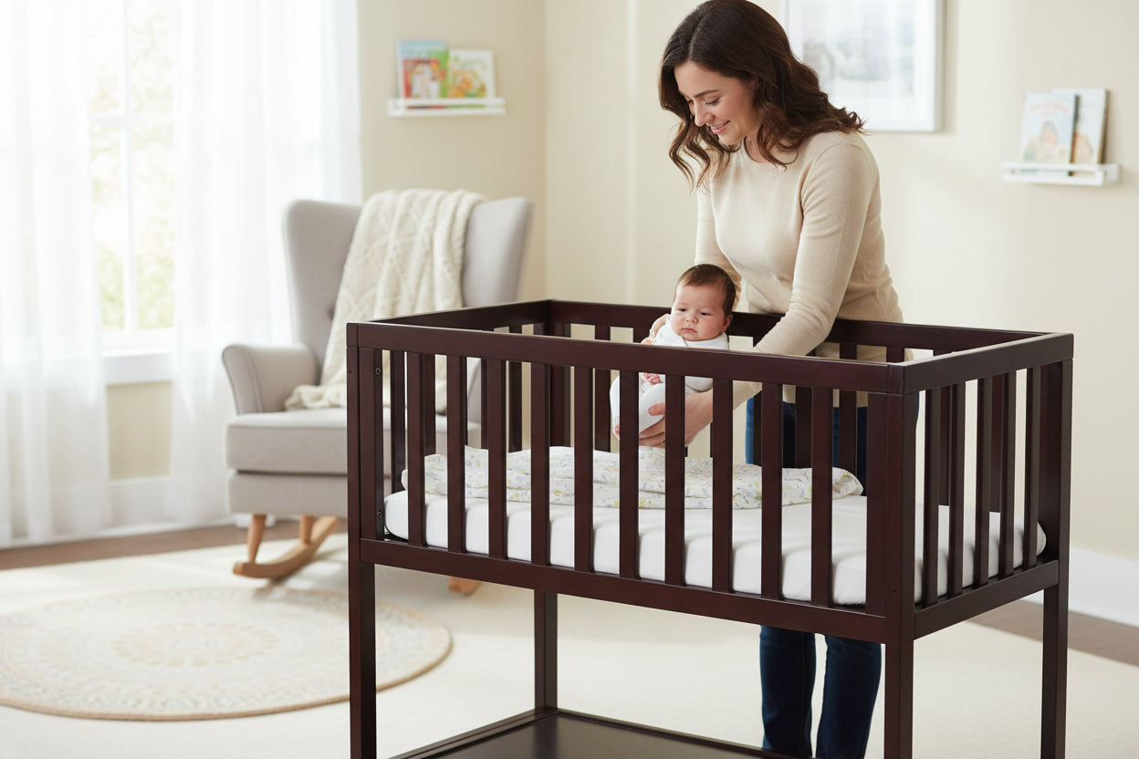 Available in two classic finishes — Espresso and White — this timeless wooden design blends beautifully with any nursery décor while providing a cozy sleep space for infants up to about 4 months