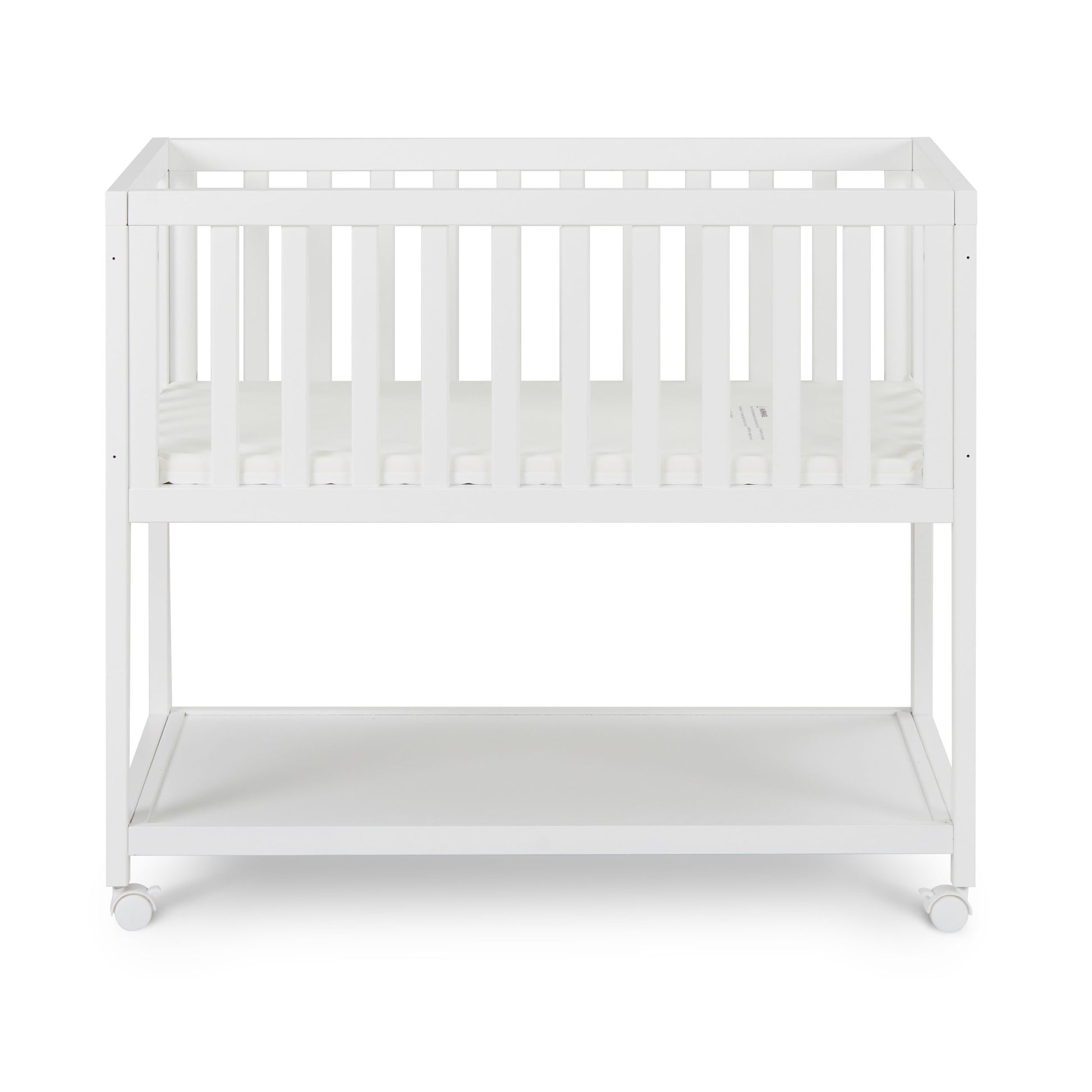 The bassinet includes stable caster wheels designed for controlled movement. Always place the bassinet on a flat surface when in use.
